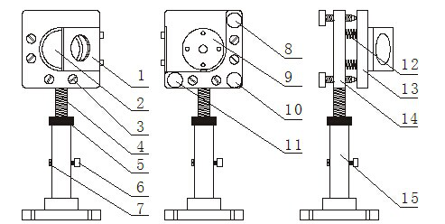 1.光靶放置架 2.反射鏡 3.拉簧鎖緊螺絲 4.調(diào)節(jié)螺桿 5.調(diào)節(jié)螺母 6.鎖緊螺絲a7.鎖緊螺絲b 8.調(diào)節(jié)螺絲M1 9.反射鏡鎖緊片 10.調(diào)節(jié)螺絲M 11.調(diào)節(jié)螺絲M2.12.拉簧 13.反射鏡安裝板 14.支撐板 15.底座.