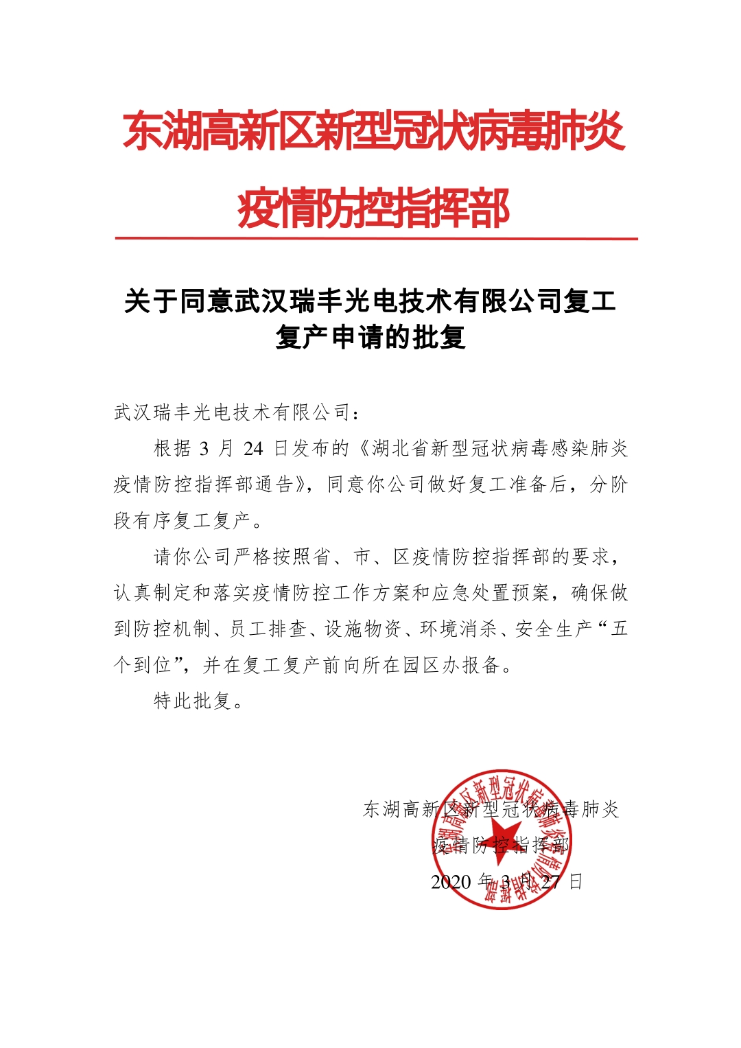 在萬眾一心抗擊疫情的非常時(shí)期,堅(jiān)決貫徹黨中央重要決策部署,認(rèn)真落實(shí)省、市會(huì)議精神及上級(jí)工作要求,隨著新型冠狀病毒肺炎疫情防控工作的進(jìn)展,疫情的控制也逐漸走向明朗的方向, 武漢瑞豐光電技術(shù)有限公司也快速響應(yīng)防疫管控號(hào)召,在通過審批后,于2020年3月30日起正式復(fù)工。